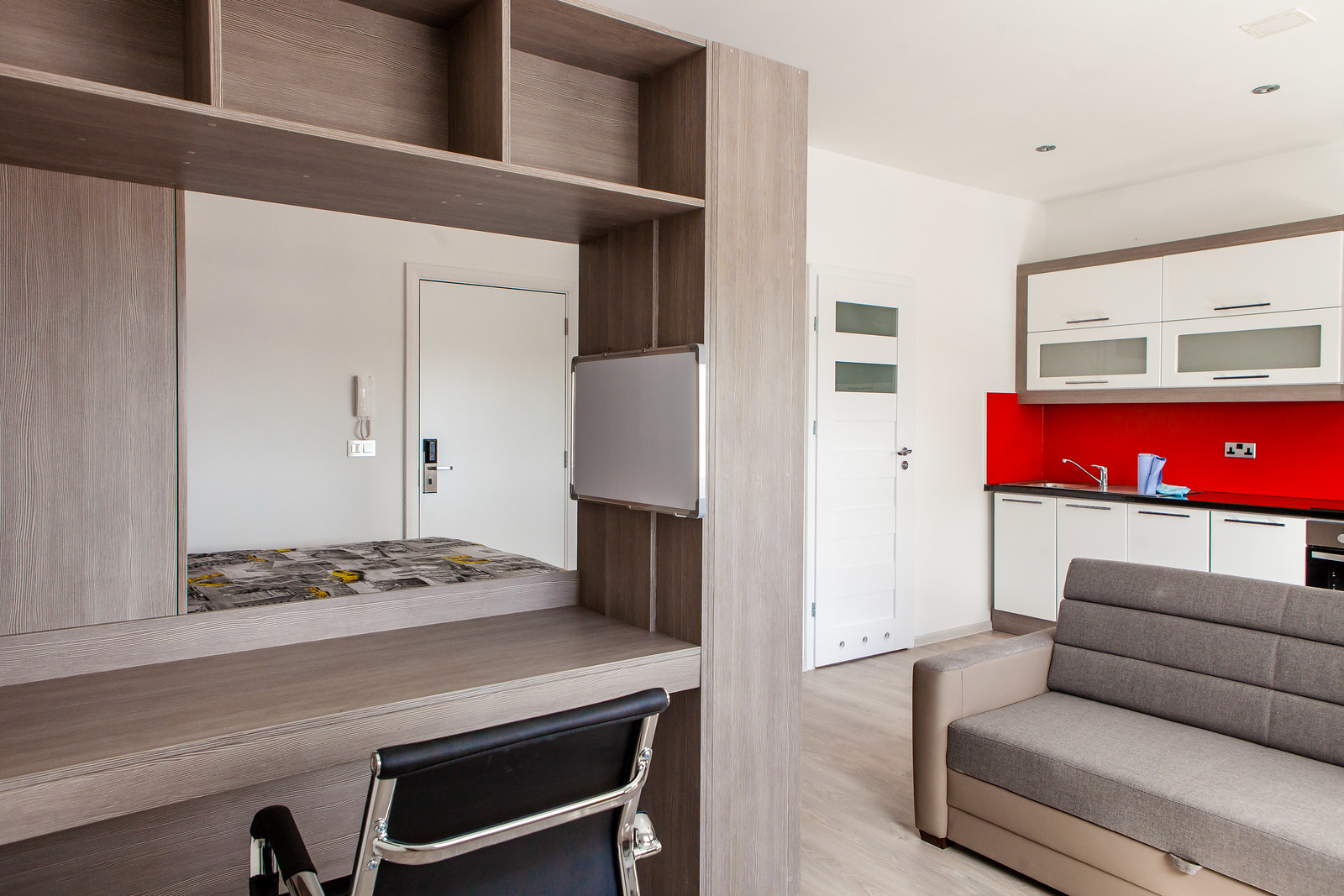 Bedroom Area: Beautifully furnished with a fitted bed, wardrobe, under-bed storage, shelving units, desk, chair, smart TV, and ethernet connection.