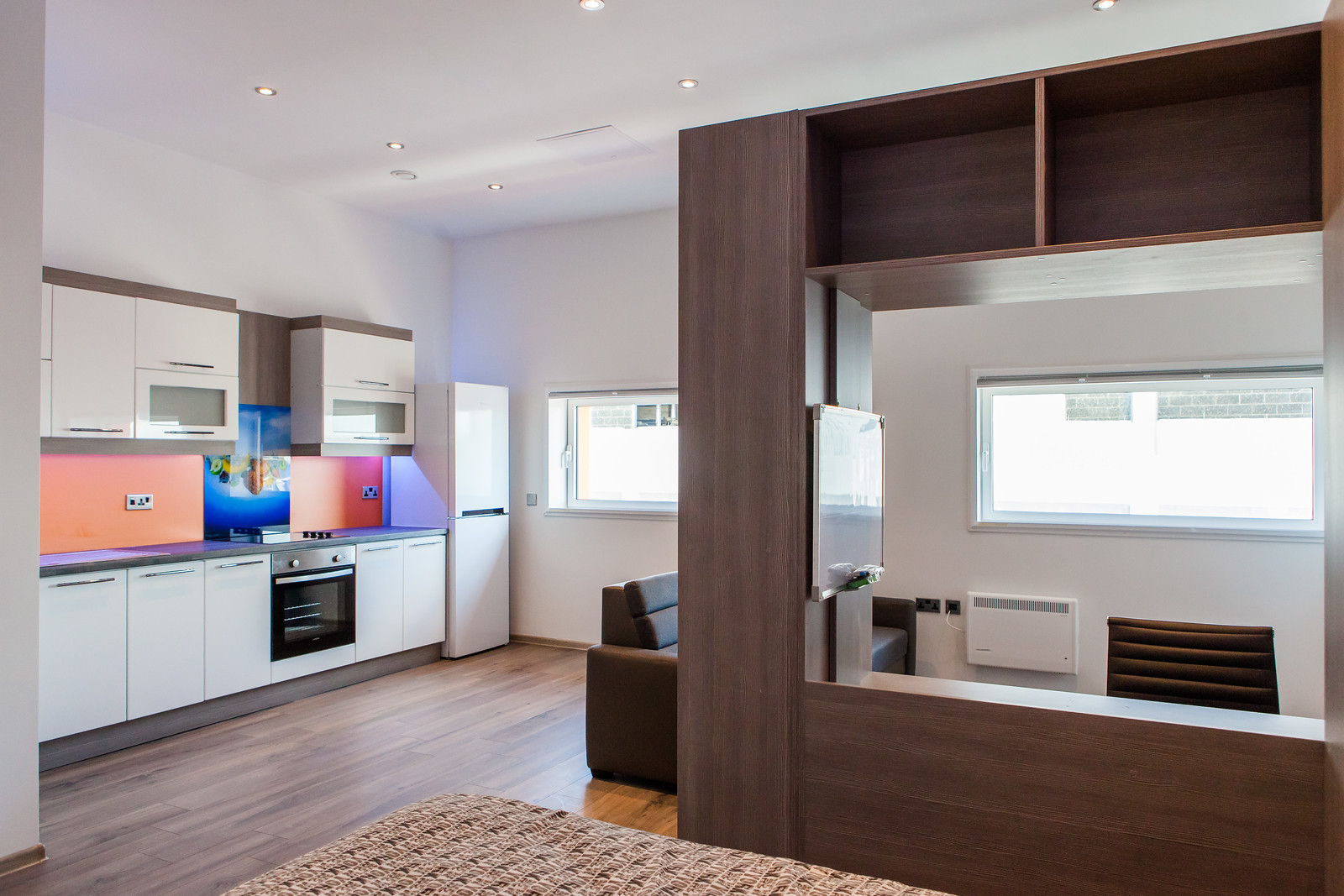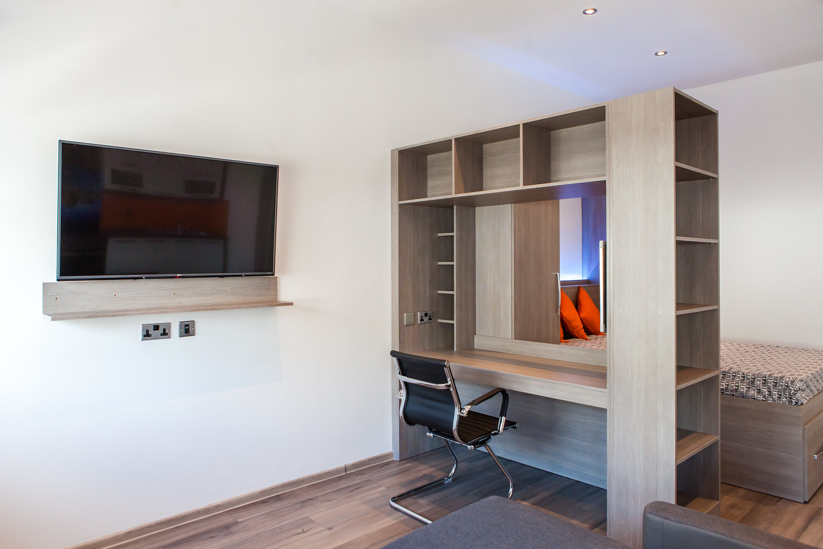 Bedroom Area: Beautifully furnished with a fitted bed, wardrobe, under-bed storage, shelving units, desk, chair, smart TV, and ethernet connection.