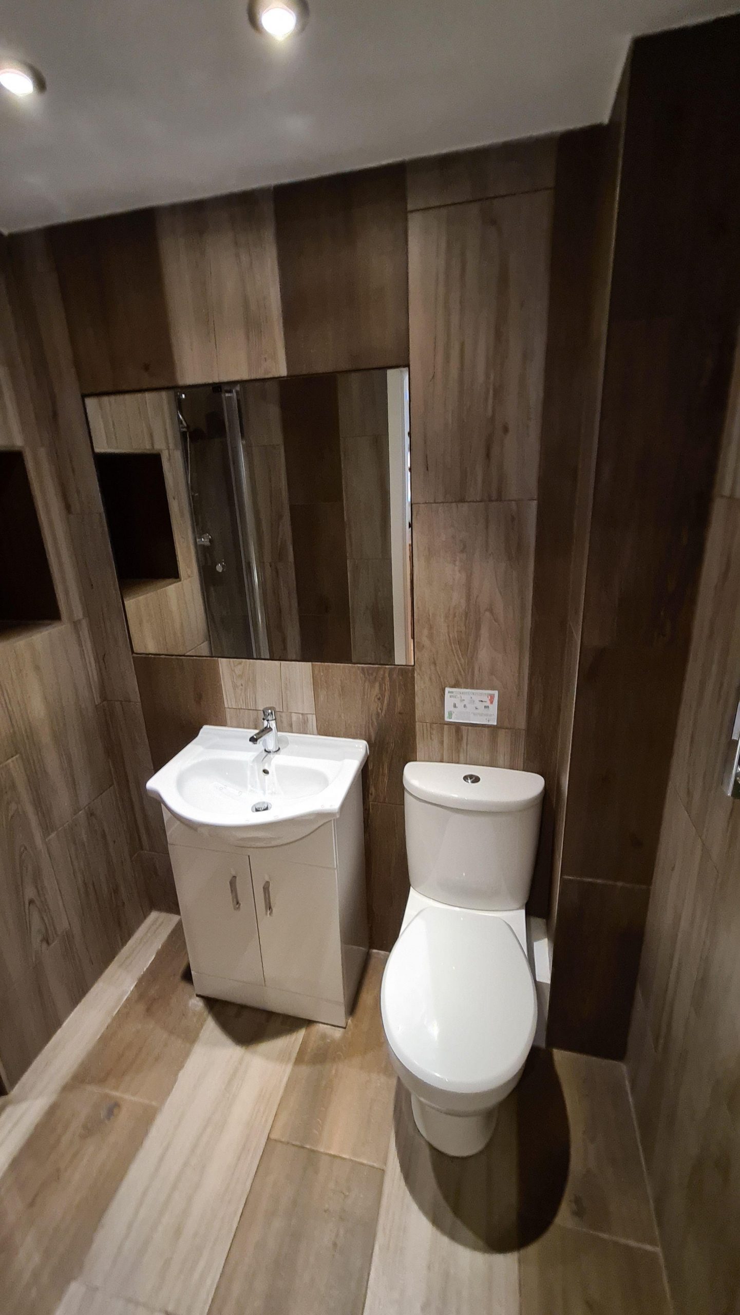 En-Suite Bathroom: A fully fitted suite comprising a shower, WC, wash basin, mirror, and shelving.